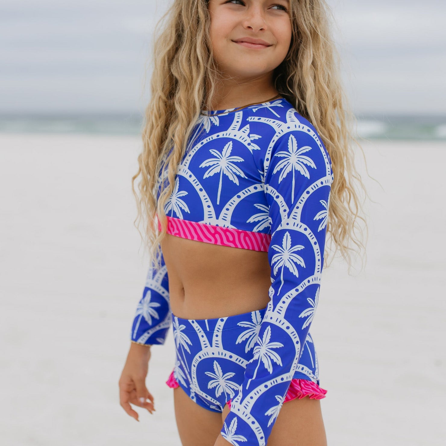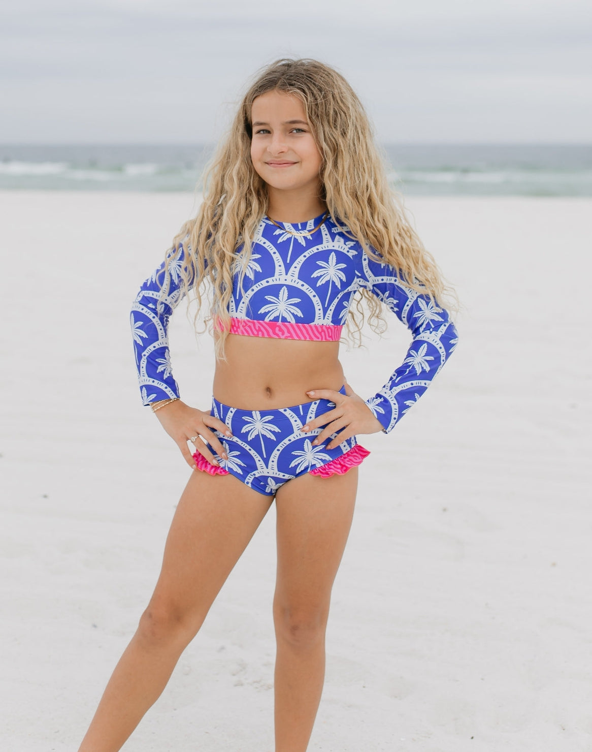 Make a splash this spring and summer in the Cleo Blue Palm Swimsuit—a fun two-piece that brings tropical vibes to your beach days. Featuring a cool blue and white palm tree print with eye-catching hot pink accents, the long sleeves offer extra coverage while keeping your style on point. Perfect for sun-soaked adventures, poolside lounging, or making waves at your favorite water spot. Playful, practical, and totally Instagram-worthy. SPF 50. Double lined throughout. High quality. Perfect for spring & summer swims! Wash on gentle cycle cold wash, hang dry. 85% Polyester, 15% Spandex