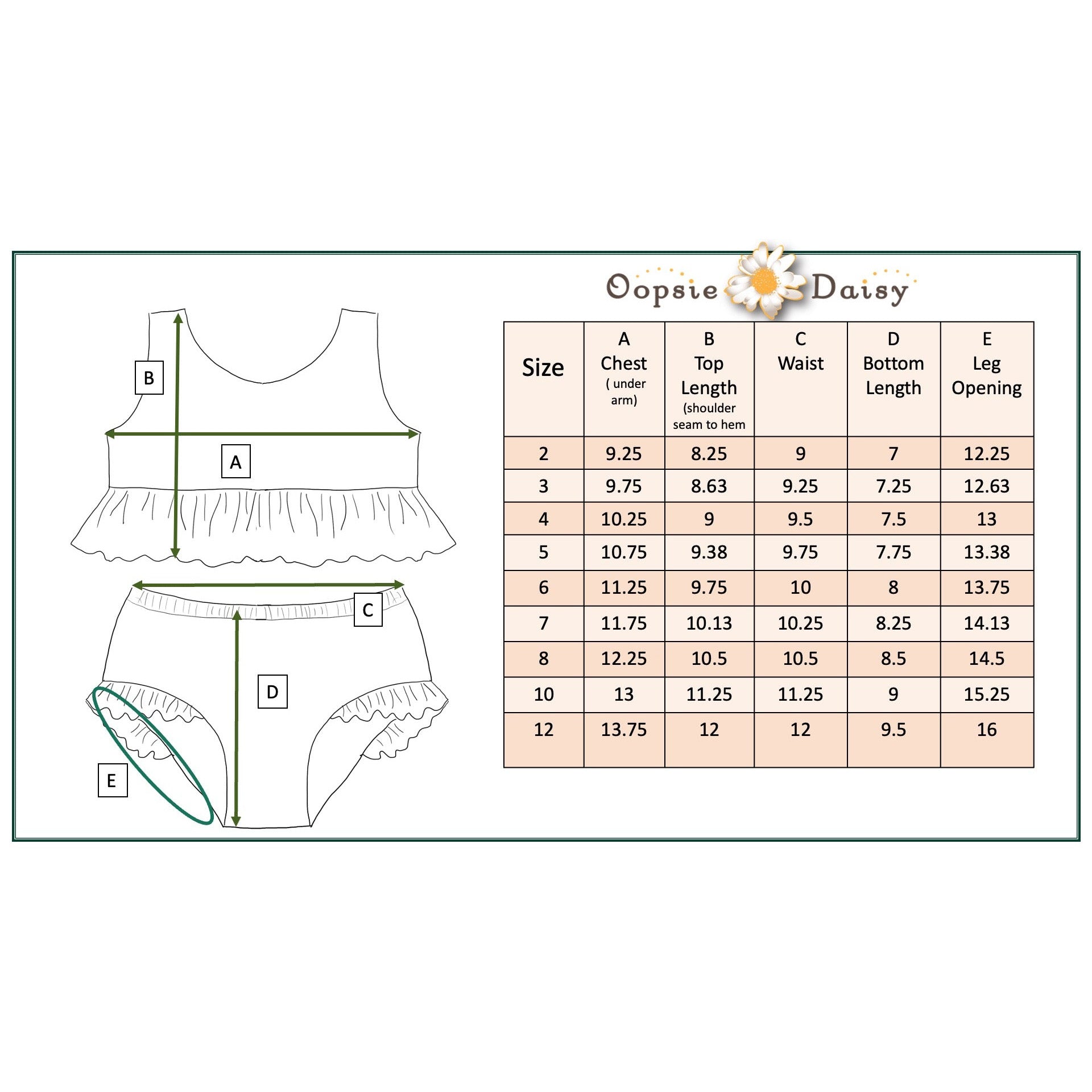 Make a splash this spring and summer in the Oaklie Lush Green Swimsuit! This adorable two-piece features a ruffled top with a cute tie-back closure, paired with matching mint and teal bottoms. Perfect for pool days, beach trips, or backyard fun, this playful set keeps her comfortable and stylish all season long. Whether she's diving into adventure or lounging poolside, she'll love the fun colors and flirty ruffled details! SPF 50. Double lined throughout. High quality. Perfect for spring & summer swims! Wash on gentle cycle cold wash, hang dry. 85% Polyester, 15% Spandex