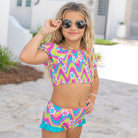 Make a splash this spring and summer in the Emma Groovy Flower Swimsuit! This vibrant two-piece features a cheerful rainbow daisy print that brings retro vibes to the beach. The ruched top with charming puff sleeves offers flattering support, while the ruffled bottoms add a fun, flirty touch. Perfect for poolside adventures and sunny getaways, this swimsuit combines comfort with eye-catching style that'll have you feeling groovy all season long. SPF 50. Double lined throughout. High quality. Perfect for spring & summer swims! Wash on gentle cycle cold wash, hang dry. 85% Polyester, 15% Spandex