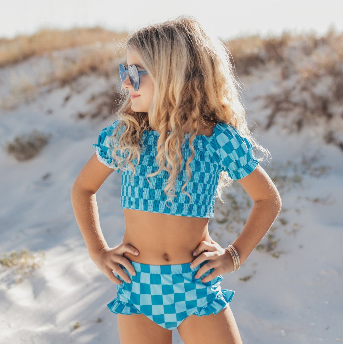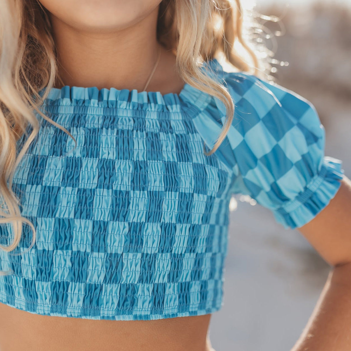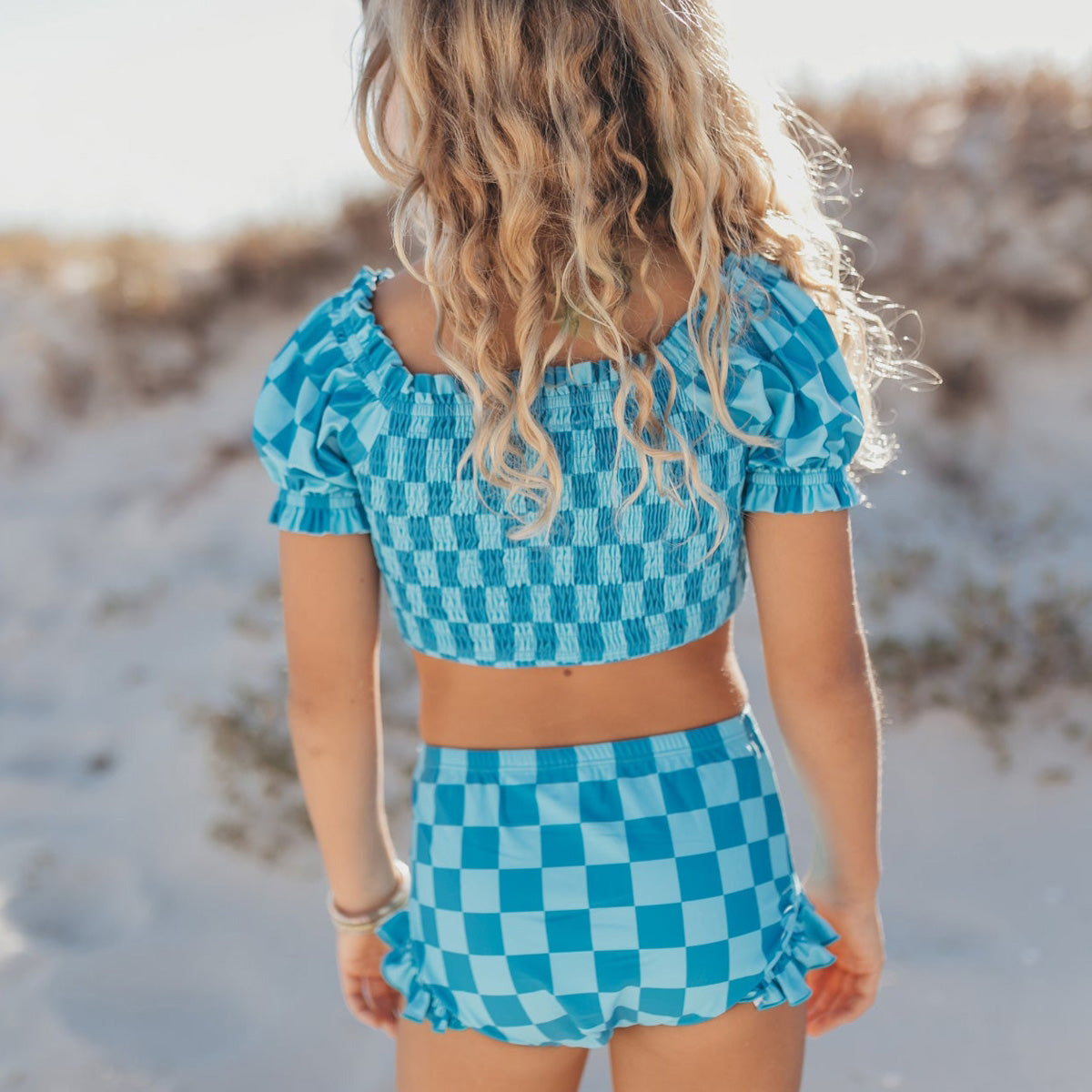 Oopsie Daisy - Turquoise Check 2pc Ruched Puff Sleeve Swimsuit